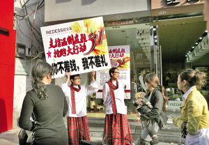 【中國鞋網】 昨天,市區五馬街紅火鳥皮鞋店門前,“小沈陽”打扮的促銷員舉著“支持溫州皮鞋”的牌子,凡是穿溫州產鞋子的消費者,到該店里消費均可獲得5.8折優惠。