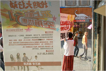 【中國鞋網】“五•一”即將到來,商家們的促銷戰也提前打響。4月28日下午,記者路過五馬街的時候發現紅火鳥皮鞋店門前熱鬧非凡,一個“小沈陽”打扮的人正在店面口高舉“支持溫州皮鞋”的牌子,大聲叫賣紅火鳥皮鞋,開始記者以為小沈陽又來到溫州了,但走近才發現原來是小沈陽的“山寨版”。