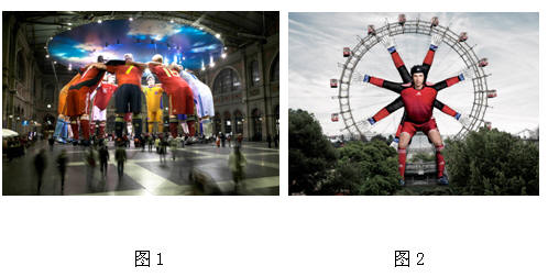 我們首先看到的是“不可能的擁抱”(Impossible Huddle,圖1)。2008年6月5日早上10點(diǎn),歐洲杯開賽前1天,阿迪達(dá)斯發(fā)布了超大號(hào)歐洲足球“巨”星。在蘇黎世中心車站安置了一群“碰頭”的足球運(yùn)動(dòng)員人偶,11位來自九個(gè)不同國家17米高的大號(hào)“足球運(yùn)動(dòng)員”肩并肩“擁”在一起,圍成一個(gè)直徑33米的圈,可謂氣勢(shì)奪人。更為絕妙的是,每天兩次(8 a.m. 和6 p.m),這些人偶還會(huì)用自己的語言向?qū)Ψ絾柡颍嗷ゼ佑痛驓狻?/P>