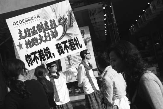【】五一即將到來,商家的促銷戰也提前打響。昨天下午,市區五馬街紅火鳥皮專賣店門前,兩名山寨版“小沈陽”舉著牌子,大聲叫賣皮鞋。據策劃這次活動的工作人員告訴記者,為了應對金融危機,紅火鳥將在五一期間開展支持溫州本土皮鞋品牌的促銷活動,故讓兩名促銷員裝扮成“小沈陽”模樣,以吸引顧客。一期間開展支持溫州本土品牌的促銷活動,故讓兩名促銷員裝扮成“小沈陽”模樣,以吸引顧客。