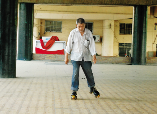 何叔說,他年輕的時候,常去工人文化宮(現在的莞城文化廣場)溜旱冰,有點基礎。禁摩之后,他不能再像從前那樣騎著摩托車四處逛逛打發時間了,于是就買了輛自行車作為代步工具出行。有一天,他逛完商場出來,發現自行車丟了。何叔想,干脆買雙溜冰鞋方便四處走走。