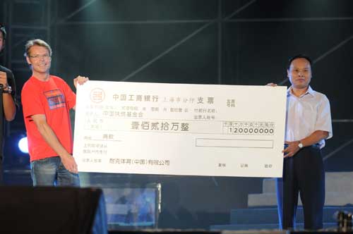 耐克體育(中國)有限公司總經理魏翰霆向中國扶貧基金會秘書長王行最捐贈“賽跑全人類10公里挑戰賽”所籌集資金120萬元