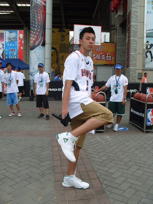 【中國(guó)鞋網(wǎng)】08-09賽季的NBA季后賽在美國(guó)如火如荼地進(jìn)行著,正當(dāng)大多數(shù)球迷沉浸于緊張激烈的比賽氛圍中時(shí),5月15日-5月17日,匹克攜手NBA籃球大篷車開(kāi)進(jìn)了廣州大學(xué)商業(yè)中心停車場(chǎng),為當(dāng)?shù)鼗@球迷們提供了現(xiàn)場(chǎng)感受NBA籃球文化的機(jī)會(huì),也為廣州愛(ài)好籃球的學(xué)子帶來(lái)為期3天的NBA球迷狂歡。揭幕日當(dāng)天,NBA雷霆隊(duì)新秀維斯布魯克到達(dá)了大篷車廣州站現(xiàn)場(chǎng),本賽季他被雷霆以第四順位選中,在最佳新秀評(píng)選中也僅次于公牛的羅斯排名第二。親臨現(xiàn)場(chǎng)的維斯布魯克除了與球迷近距離接觸外,還接受了球迷的挑戰(zhàn),令現(xiàn)場(chǎng)球迷激動(dòng)不已。