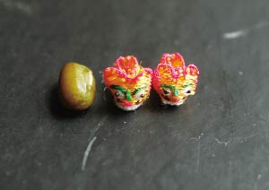 但讓人沒有想到的是,喜歡與眾不同的任廷麗卻把這繡花鞋越做越小,直到現(xiàn)在做得比米粒還要小。記者在任廷麗家看到,一只小小的雪花糕瓶蓋里竟然裝了好幾十雙繡花鞋,而且品種也不少,有小孩兒穿的貓頭鞋、虎頭鞋還有豬頭鞋,最小的繡花鞋只有四毫米,一個(gè)成人的指甲上能放上這樣的鞋子四雙還綽綽有余。
