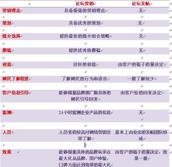 從上面的介紹,大家就能清晰明白了論壇營銷和論壇發(fā)帖的區(qū)別,有的客戶就拿論壇發(fā)帖和論壇營銷說事,說哪家公司幫助他們發(fā)了多少貼啊,這個不是論壇營銷,一般的發(fā)帖團(tuán)隊(duì)都能干的事,就是論壇發(fā)帖她和論壇營銷有很大的區(qū)別。我再用一個表格對比下,讓大家直觀地看出來。