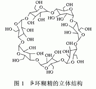 β-環糊精是由淀粉經酶解環化而成的由7個吡喃葡萄糖單元以α-1,4甙鍵連接的環狀低聚糖化合物,它形成了一種中空立體結構的籠狀化合物,如圖1所示.吡喃葡萄糖環上的氫原子位于空腔內并覆蓋了配糖氧原子,使空腔內部成為疏水性空間,環糊精分子空腔邊緣含有羥基,使空腔外部表現為吸水性.這種憎水性內腔可與很多油溶性物質結合形成一種特殊的包合物,而親水的外腔可增大油溶性物質在水中的溶解性,形成具有緩釋作用的微囊,它已在醫藥、食品、農藥、化肥的緩釋上得到了較好的應用[4-6].