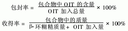 精密稱取上述一定質量的β-環糊精包合物,加0.2g硫酸銅,3g硫酸鉀及20mL硫酸,在消化爐中消解45min后自然冷卻.放冷后,用全自動凱式定氮儀測定包合物中氮的摩爾量即為包合物中含OIT的摩爾量,并按中國藥典2000年版微囊、微球與脂質體制劑指導原則計算包封率和收得率: