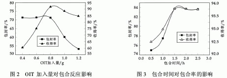 OIT的用量影響到所得產品的包封率和成本,因為β-CD的空腔容納OIT有一飽和量.OIT加入量的影響如圖2所示,包封率曲線顯示,當OIT加入量從0.40g增加到0.80g時,隨著OIT投入量的增加,包封率基本保持不變,都在70%以上,此后再增加OIT投入量包封率不斷減少.這是由于提高OIT的投入量,雖然可以使包合物中OIT的絕對量稍有提高,但同時有大量的藥物游離在外.而從收得率曲線可以看出,當OIT投入量為0.8g以下時,收得率很低,說明有很多的β-CD過量未參與反應;當OIT投入量為0.8g,收得率達到最大值時,再增加OIT投入量則收得率降低,說明此時的OIT為過量,故從包封率和收得率曲線可以看出,OIT投入量以0.8g為最佳.
