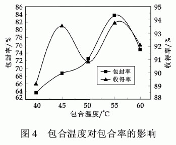 通過對包合物形成過程的熱力學分析可知,環糊精分子空腔無論是在固相還是在水溶液中并非是空著的,而是結合有水分子,范德華力和疏水鍵互相作用、氫鍵和釋放能量、電荷轉移以及π-π堆積都是包合物形成與穩定的驅動力.伴隨包合物的形成會有明顯的熱量變化,因此溫度也是包合過程重要的影響因素.包合溫度過低,則β-環糊精在水中溶解度較小,不利于包結絡合過程,此時Ka迅速下降,影響包合向產物方向進行.包合溫度的影響如圖4所示,由包封率曲線可知,溫度為40~55℃,包封率隨溫度的升高而增加,在55℃時包封率最高.當包合溫度上升至60℃時,包封率反而降低.這是因為在一定溫度范圍內,提高包合溫度能增加β-環糊精的溶解度,并為OIT的絡合提供動能,促進二者的相互碰撞幾率,有利于包合物的生成.但當包合達到平衡后,過高的溫度又促進了已形成的包合物中OIT分子的熱運動,導致包合物的解絡.由收得率曲線可以看出,包合溫度對收得率影響不大,在55℃時收得率相對較高,故溫度以55℃為宜.