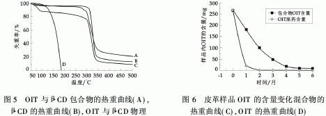 從圖6可以看出,經過β-CD包合,皮革在放置一個月后其中的OIT濃度減少了69.78%,放置兩個月后減少了31.46%,而直接浸涂OIT的皮革樣品則其在放置20天左右已基本揮發殆盡,故可證明經本實驗β-CD包合的OIT具有良好的緩釋性能.