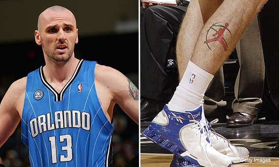 【中國鞋網】每年的總決賽里都會發生一些有趣的花絮,今天也不例外。本來大家已經準備好了在總決賽里看科比和詹姆斯的耐克大會師,總決賽版的ZK4對上總決賽版的ZLS3,那將是一副多么美麗的畫面。但是霍華德和他的魔術還是讓這個貌似完美的神話破了產。話說魔術隊恐怕是聯盟里代言球鞋款式最多,球員分布也最均衡的球隊了。霍華德和特科格魯代言阿迪達斯,劉易斯和皮特魯斯是耐克Hyperdunk的忠實擁躉,賈馬爾·尼爾森一直是匡威的代言人,阿爾斯通為And1當模特已經有十幾年了。但是最有趣的故事還是發生在最不起眼的一個人身上:波蘭人戈塔特。戈塔特與姚明一樣,是銳步的簽約球員。但是因為總決賽,戈塔特卻差點跟銳步鬧翻,原因是波蘭人右腳小腿上的一個文身。