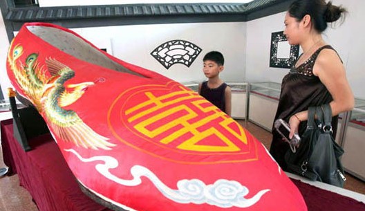 當日,浙江省溫州市展覽館展出一只巨型甌繡中式婚禮鞋。這只婚禮鞋全長2.8米,寬0.87米,高0.71米,重63公斤。鞋面以10多種溫州傳統甌繡針法,采用60多種真絲色線繡制成彩鳳金龍圖案和雙喜字。整個鞋體由7名繡工和技師使用1公斤真絲彩線、5匹布和100多公斤其他材料,耗時半年多制成。