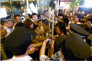 東城區公安分局和東城區城管大隊派出多人到現場維持秩序。工作人員首先將店內購物結束的顧客從側門進行疏散,保持店內有足夠的空間。然后把守商店后門,嚴禁人員出入。警方則在前門拉起警戒線,要求等候的顧客到商店工作人員處取號,依號排隊,在警方的控制下分批入場。