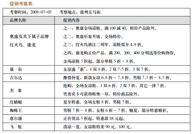 F. 連環店有利于促銷:以涼鞋促銷為案例,筆者7 月初對溫州五馬街鞋業商圈的促銷進行了考察,發現奧康攜其子品牌,在五馬街的頭、中、尾地段用概念店、旗艦店、形象店、普通專賣店各個出擊,在聲勢上壓倒競爭對手,店鋪人氣指數很高。與其它品牌不同,奧康及其子品牌促銷內容多樣,避免了同質化,詳見下表。