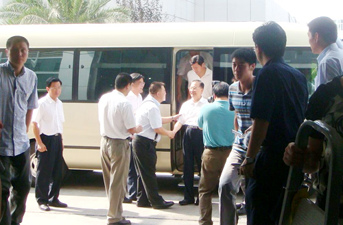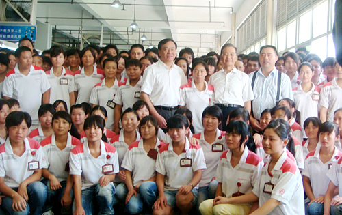 奧康生產車間二分廠針車線的全體員工,知道總理要來看望他們后,自發列隊等侯在總理乘坐的電梯外,總理一出電梯,大家熱情地鼓掌并高呼“總理好”。溫總理看到員工列隊歡迎,顯得十分開心,不停地鼓掌、舉手表示謝意。