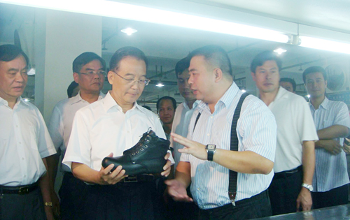 “主要有兩方面原因,第一是來自團購訂單,今年我們團購訂單增長非常快,有全國各地政府機關的,公檢法系統的,航空航海系統的,企事業單位的。”王振滔引著總理來到了旁邊一條生產線,像現在總理看到的這些鞋子就是我們為青海省生產的警用鞋團購訂單。“另外一個就是來自內銷,我們主要走連鎖專賣的渠道,就是自己開專賣店,今年公司積極拓市場、保增長,雙管齊下,加大開店力度,現在全國專賣店有3000多家。”