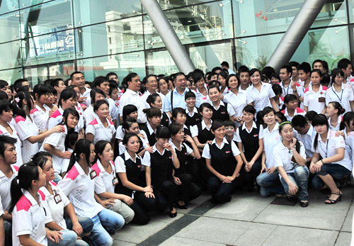 “大家來自五湖四海,有湖南的、四川的、安徽的、河南的,非常不容易。我剛問了一位員工,她叫康昭華,來自四川巴東,剛來一年,一個月就能領到2000多塊工資,一年還能給家里寄不少錢。在這個經濟環境下,很多地方出現返工潮,你們有這樣的待遇,一定要珍惜這樣的機會,把奧康當成大家庭,把心放在這里,努力愛惜本職工作。同時也希望奧康繼續做強做大,承擔更大的社會責任,解決更多的就業崗位,讓更多的人賺更多的錢去回報家人。”總理語重心長地說到,頓時整個車間里響起了雷鳴的掌聲。末了,總理還提議跟員工們合影,閃光燈下,是員工們一顆顆激動的心和一張張燦爛的笑臉。