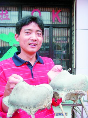 瞧,廖海兵手上拿的就是將在鞋展上出現的最老的木屐