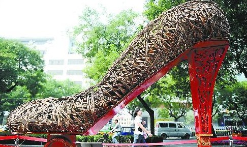 【中國鞋網】昨天,在西單北大街的東西兩側,以“高跟鞋”、“口紅”、“女士挎包”為造型的幾個花籃正在擺設。這些用藤條編成的花籃,吸引了過往行人的目光。