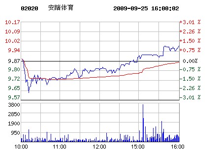 | 安踏體育代碼:02020.hk | 9.980.10 1.01%2009-09-25 16:00:02 | 昨收:9.88 今開:9.88 成交:58,939最高:9.99 最低:9.61 均價(jià):9.84流通:24.91億 市值:248.32億 換手:0.00% |