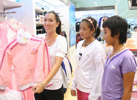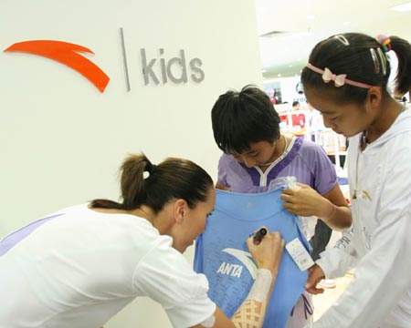 隨后在安踏兒童店內,揚科維奇與安踏贊助的兩位青少年網球選手"零距離"接觸,她不僅熱情地配合小球員簽名合影的要求,還輔導他們說:"不要輕視網球帽、網球服和網球鞋等裝備選擇的細節,它會幫助你取得成績上的突破!"說完,揚科維奇便親手為小球員挑選專業的運動裝備,并耐心地進行講解。