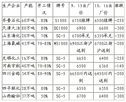 市場(chǎng)期待已久的房地產(chǎn)銷售“金九銀十”和“黃金周”并未實(shí)現(xiàn),PVC今年的旺季需求平淡,現(xiàn)貨市場(chǎng)上從8月以來(lái)一直維持觀望看空,成交持續(xù)清淡。隨著期價(jià)的大幅下跌,各生產(chǎn)廠商的出場(chǎng)報(bào)價(jià)也有了一定的下調(diào)。(見表1)