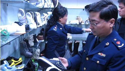 4日上午9時,記者進入溫州服裝市場第一家鞋店,看到貨架上放著不少標有耐克、阿迪商標圖案的鞋子。據執法人員介紹,這些鞋子雖然在外型上與阿迪、耐克等品牌運動鞋有些差異,但在商標圖案等方面進行了模仿,成為“低仿”鞋,屬于假冒偽劣產品,依法應予以沒收。