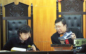 【中國(guó)鞋網(wǎng)】印有“彪馬”圖案的鞋在法官手里傳遞并查驗(yàn)。上午,在一中院法庭,稱(chēng)商標(biāo)被侵權(quán)的德國(guó)一公司向中踏鞋業(yè)公司索賠50余萬(wàn)元。