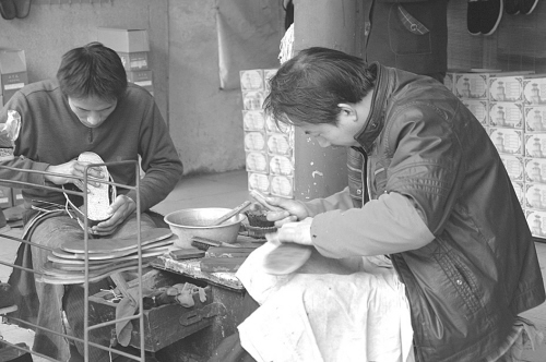 平遙古城一家手工鞋坊內,兩名匠人正在趕制鞋子