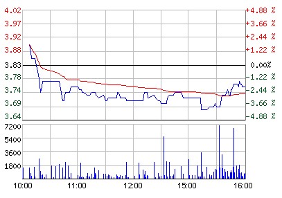 昨收:3.84 今開:3.94 成交:109,025 最高:3.94 最低:3.67 均價:3.71 流通:21.74億 市值:81.08億 換手:0.01% |