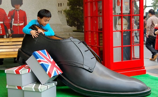 中國鞋網11月11日訊,11月8日,在延安路銀泰門口,一只超大的皮鞋吸引了很多人的目光,一個小男孩忍不住好奇,干脆與大皮鞋來個親密接觸,一探究竟。