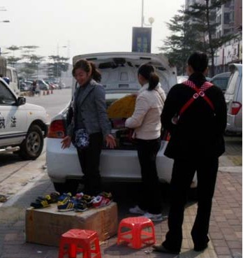 中國鞋網12月09日訊,一名漂亮的美女大學畢業生,由于沒找到工作,于是上街在轎車擺攤賣鞋,沒想到被執法人員以亂擺賣進行了處理。今日上午,南莊執法人員對該宗用小車在南莊帝景北路亂擺賣的違法行為進行了處理。
