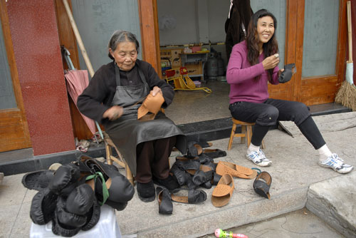 在呈岸村,時不時可以見到婦女、老人坐在院子里,縫鞋幫的同時不忘照看孩子。“家里的事不耽誤,有空就做一點,也是打發時間,還多少可以補貼點家用。”77歲的鄭阿婆雖然動作慢點,但縫一雙老年鞋幫可以賺5角,一個晚上也能賺十幾元錢了。