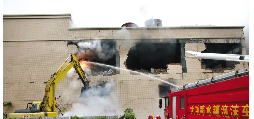 由于車間靠外的墻面上并沒有窗戶,消防隊員調來了一輛挖掘機,用鏟子在外墻上鑿開了三個大洞,消防隊員拿著水槍從墻上的大洞向著火的車間噴水。