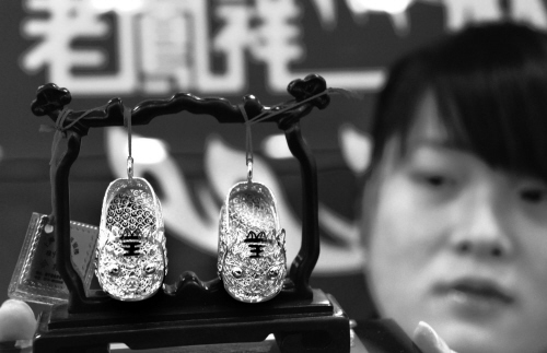 中國鞋網01月09日訊,昨天,一位姑娘在展示工藝虎鞋擺件。隨著農歷虎年的臨近,江蘇省睢寧縣黃金首飾年貨市場上的生肖虎擺件和飾品賣得紅紅火火。