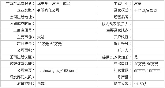 我公司做皮革已有10多年的在歷史,一直以來我公司本著質量第一,薄利多銷的原則,生產大量的綿羊皮、皮胚、成品;山羊皮、皮胚、成品。我公司資金力量雄厚,在廣州、浙江、海寧等大城市建利多個銷售部,實行廠家直銷,我公司在河北省里縣有2個工廠,高資聘請一流頂尖工程師,技術員生產工藝,確保質量第一