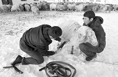 新疆冰雪嚴寒綿羊穿上膠皮鞋
