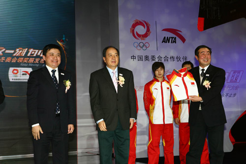 國家體育總局副局長、中國奧委會(huì)副主席肖天與安踏體育用品有限公司執(zhí)行副總裁鄭捷將2010冬奧會(huì)中國代表團(tuán)領(lǐng)獎(jiǎng)服交予冬季運(yùn)動(dòng)管理中心主任趙英剛.