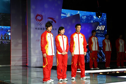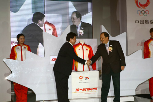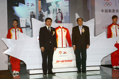 國家體育總局副局長、中國奧委會(huì)副主席肖天與安踏體育用品有限公司執(zhí)行副總裁鄭捷共同揭幕2010冬奧會(huì)中國代表團(tuán)領(lǐng)獎(jiǎng)服