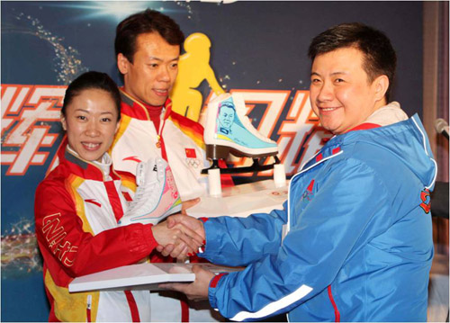安踏體育用品有限公司執(zhí)行副總裁鄭捷向申雪趙宏博贈送彩繪戰(zhàn)靴