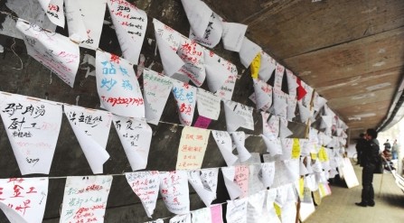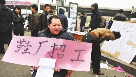 為吸引務(wù)工人員,鞋廠工作人員舉著牌子招工