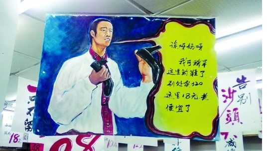 右圖為其中一幅,內容是小沈陽充當廣告模特,用東北方言向過往客人招呼生意。記者了解到,鞋店的老板是一名民間畫家。有網友驚呼,“看來高手還是在草根當中”。
