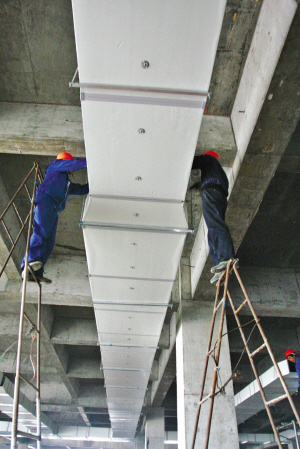 展館內(nèi)部正被隔成多個展位。圖為施工人員在安裝冷氣管道。