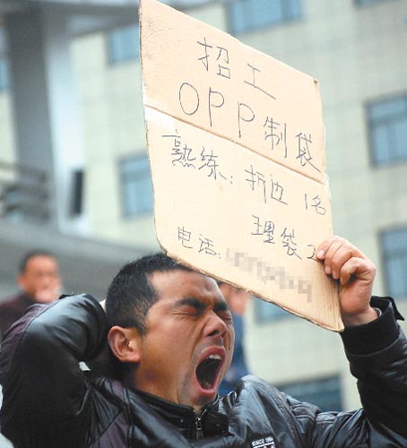 中國鞋網03月06日訊,“快來看,快來看,這有高薪職位嘍!”香港福燕兄弟集團負責招工的員工拿著擴音器一遍一遍地吆喝。
