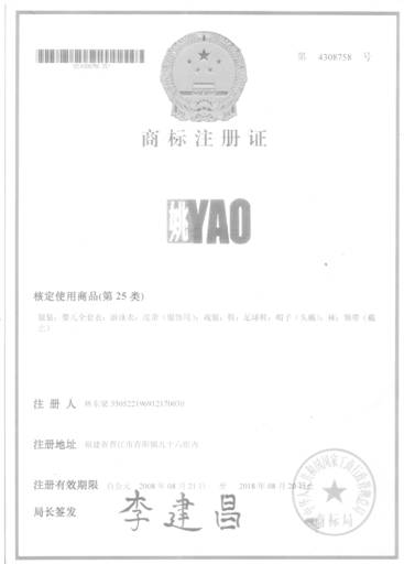 二、其次,姚YAO 品牌是福建凱帆體育用品有限公司在國內(nèi)注冊(cè)的一個(gè)品牌商標(biāo),擁有合法的使用權(quán),受國家法律保護(hù)。姚YAO品牌商標(biāo)注冊(cè)號(hào)為第4308758號(hào) 。