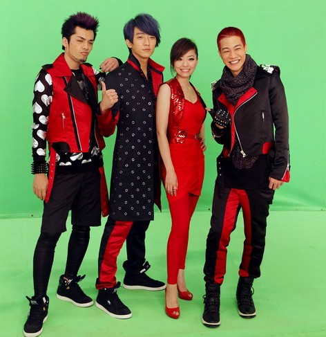 張靚穎一身紅色勁裝,站在三個男生中間真是當之無愧的“紅花”啊。