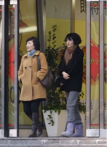 王菲踏著淡紫色雪地靴,略顯平凡素雅。