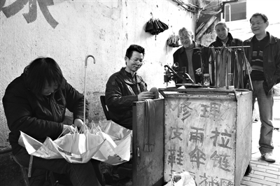 豐壽里巷口,鐘林生與妻子正在修鞋修傘。見(jiàn)記者采訪,一旁的幾個(gè)居民爭(zhēng)著夸獎(jiǎng):鐘師傅真是好,吉慶街就要拆遷了,以后沒(méi)有了鐘師傅,還真的不方便……他們還講了鐘師傅的很多故事。
