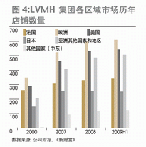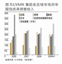 兩廂作用之下,奢侈品牌一邊加緊完善在中國的網點布局,一邊調整營銷策略。范思哲于2009年10月撤離日本市場,計劃投資5600萬美元重新布局亞洲市場,把重心轉移至中國。2009年12月底,LV在中國市場的第24家門店在長沙開張,與在19個城市擁有28家門店的Gucci一樣,全部為集團直接掌控的直營店。LVMH集團的財報顯示,2000-2009上半年,最明顯的兩個趨勢就是日本市場的逐漸隕落以及由中國領銜的亞洲其他國家和地區的崛起。2009年上半年,只有除日本以外的亞洲國家和地區實現了店鋪數量與對集團收入貢獻的雙重增長,其中,絕大部分的貢獻顯然來自中國(圖3、4)。如果從服飾皮具類商品的收入區域分布來看,這一趨勢更加明顯(圖5)。