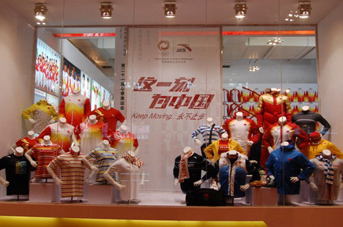 安踏展廳以中國(guó)冬奧會(huì)代表隊(duì)的服裝為背景墻,整個(gè)展館閃耀出冬奧會(huì)拼搏的體育精神,這正如安踏一直秉承的“愛(ài)拼敢贏”的精神。